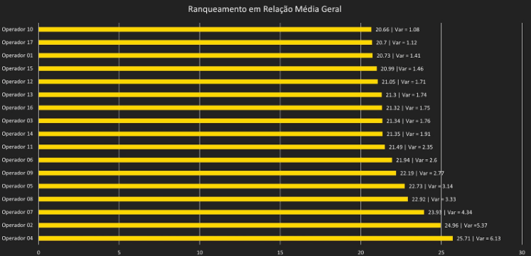 Também é possível compreender, de forma mais detalhada, quais operadores têm mostrado ineficiência na operação de acordo com a velocidade média obtida mensalmente. Como podemos observar no gráfico abaixo e/ou avaliar quais operadores tem o perfil operacional ideal.