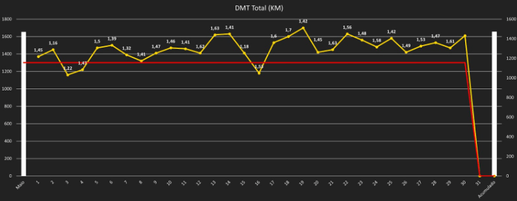 Ao observar a tendência de aumento de DMT, isso indicará que a sua operação está se tornando cada vez mais eficiente. Por outro lado, quando o comportamento de DMT estiver diminuindo, está atrelado à ineficiência. Em relação ao combustível, quanto menor o consumo de combustível, maior será o DMT, isso ocorre porque o DMT é dividido pelo consumo de energia.