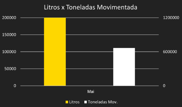 O gráfico abaixo mostra que a operação de mineração movimenta 663 mil toneladas de material por 200 mil litros de combustível (aproximadamente). Isso significa que a operação está consumindo cerca de 0.3 litros/ton de material movimentado.