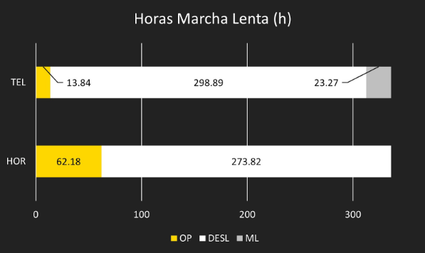 A operação marcha lenta também está inclusa e pode ser observada pela telemetria. Equipamentos que ficam em marcha lenta por longos períodos de tempo podem consumir uma quantidade significativa de combustível sem gerar resultados de forma improdutiva. Este indicador pode estar associado, por exemplo, a qualidade das rampas e acesso, assim como a marcha lenta enquanto esperam o carregamento e/ou manutenção.
