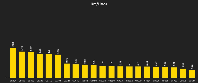 Diferente do gráfico citado acima, que é útil para analisar o consumo de combustível, o gráfico de Km/L é de suma importância para analisarmos a eficiência que o combustível está sendo usado.