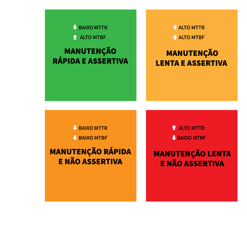 Se o tempo médio de reparo quanto o tempo médio entre falhas são altos, isso indica uma manutenção lenta e assertiva. O equipamento volta para manutenção poucas vezes, porém, leva mais tempo para corrigir as falhas, a falta de agilidade da equipe de manutenção pode ser causada por diversos motivos: falta de treinamento, equipe subdimensionada, falta de peças, falta de mão de obra especializada ou por ineficiência.
